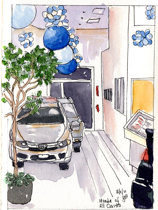 The El Cerrito Honda dealership was kind enough to allow our Tuesday night urban sketchers group to come and sketch in their showroom. There were chairs and tables for us to sketch and paint in comfort and interesting architecture and cars to draw. I remember boys drawing cars all the time but never thought that someday I’d go out of my way to draw cars too.