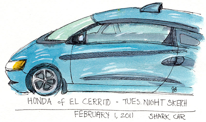 I drew this car at the end of the evening and it was so close to me that it got way out of proportion and then started looking like a shark with whatever that thingee was on top. It’s good to develop the ability to see and draw cars because they’re everywhere, and leaving them out of a scene can look strange.