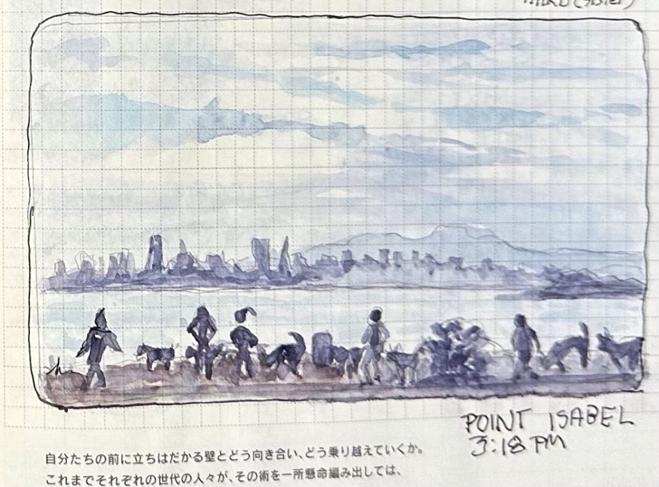 While my journeys may have become more interior thanks to the pandemic, illustrating where my imagination and dreams take me keeps me entertained. But I’m also including sketches from places I go in real life, like Point Isabel above, a huge park along the SF Bay where dogs can run free, roll in the grass, splash in mud puddles and rinse off in the bay.