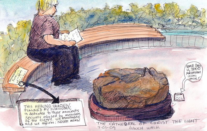 The healing I found in the garden came from sunshine and sketching, not from sitting next to the huge concrete cathedral, on a hard wooden bench, gazing at what turned out to be a sculpture of a big cracked rock, not an actual rock.