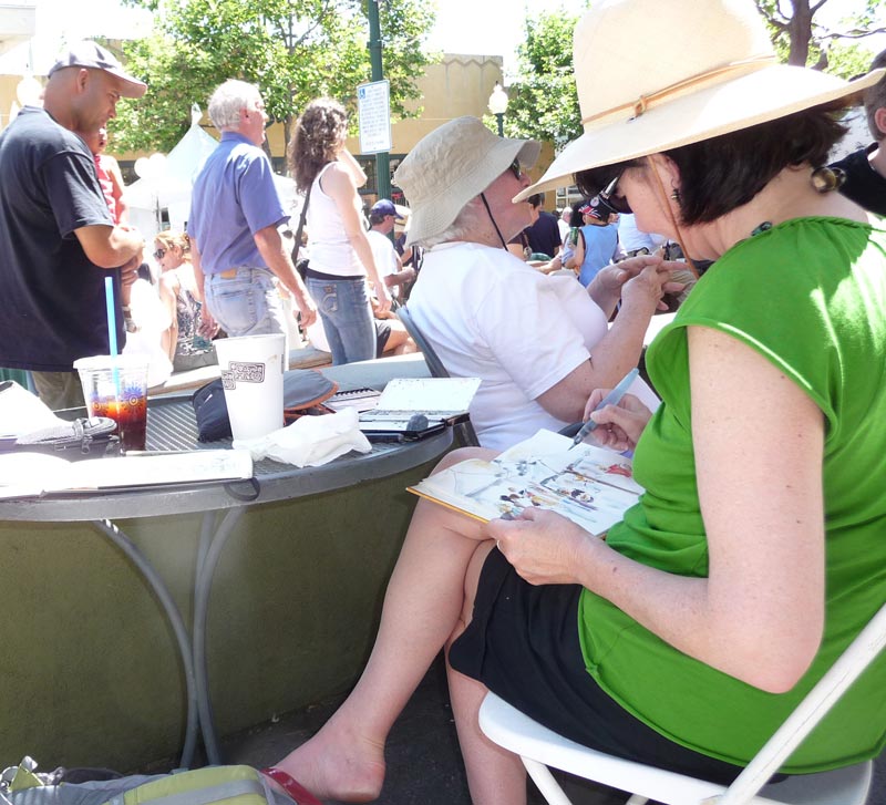On the way to our next stop (Dick Blick Art Supplies to pick up a large sketchbook to bring to the afternoon session of the figure drawing marathon sponsored by the Bay Area Models Guild at Merritt College in Oakland) we passed Berkeley’s Fourth Street boutique/foodie shopping area. We saw that the street was blocked off with a sign, “Fourth Street Jazz Festival” and decided to nix the figure drawing and sketch at the festival instead.