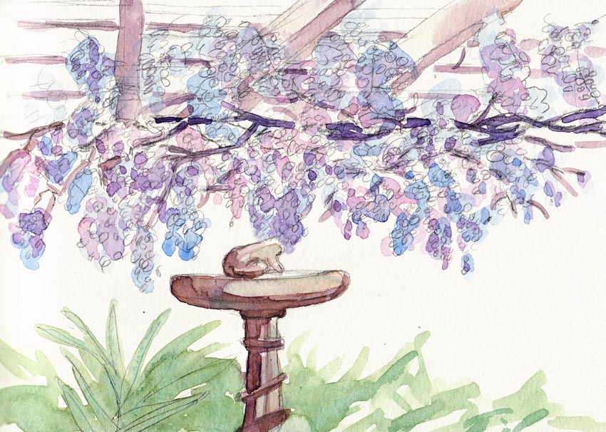My plein air painting buddy Cathy, invited me over to sketch her wisteria which was blooming in her beautiful, backyard Zen garden.
