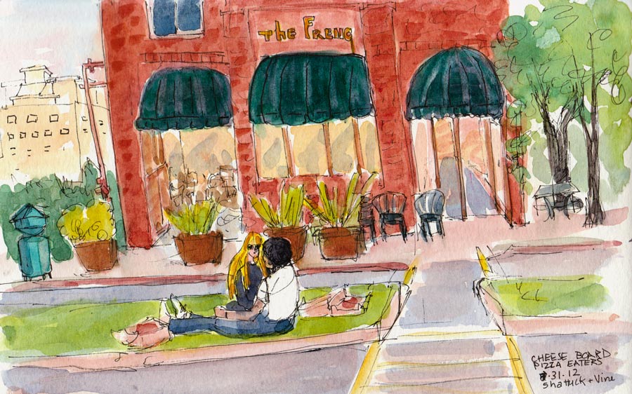 The 90-year-old owner of this house on Allston and McGee in Berkeley has trimmed the bonsai trees in his garden for 50 years and they are beautiful. I enjoyed sketching from in front of his house while my sketch buddies took posts across the street and on the corner.
