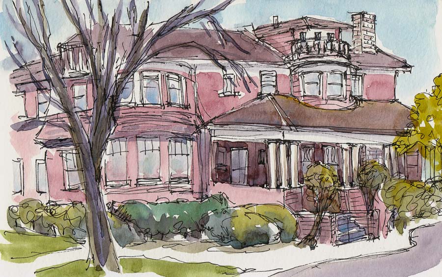 I would have loved to draw the Walnut Creek Historical Society volunteers serving in white aprons, the fancy table settings, and most especially the gang of Red Hat Society ladies seated in one of the rooms. I waited outside and sketched the building, hoping to capture them coming out after the tea but they dawdled so long I had to leave or get stuck in rush hour traffic.
