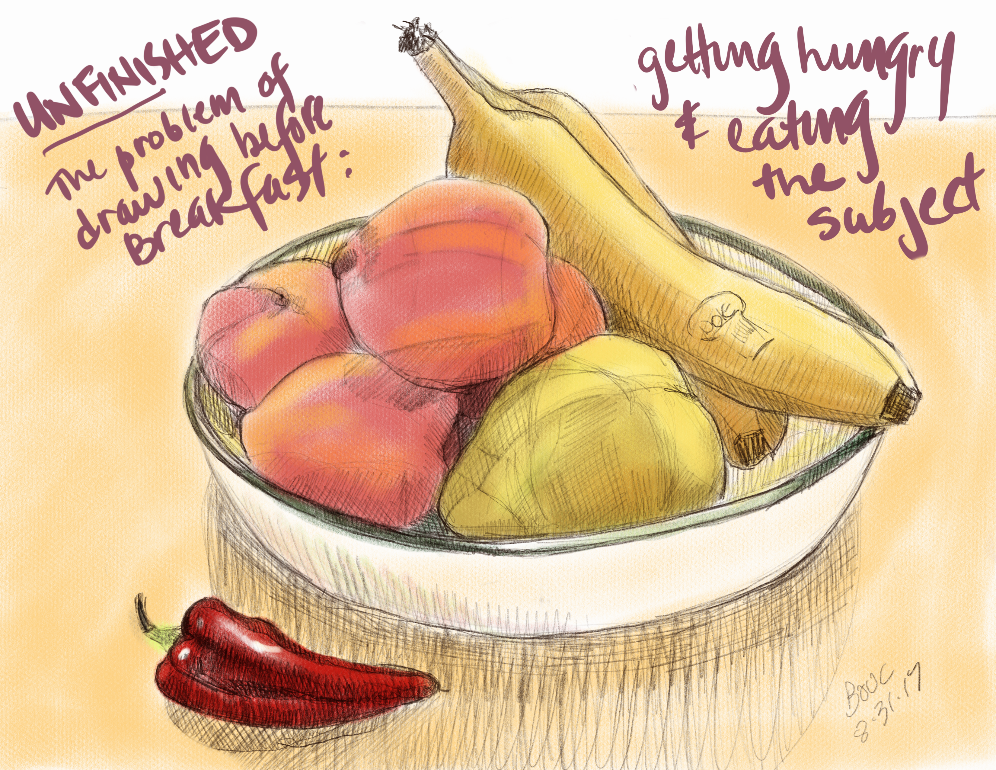 Not sure which I prefer. I couldn’t finish the drawing since I ate half of a peach and a banana for breakfast and then needed to refrigerate the rest.