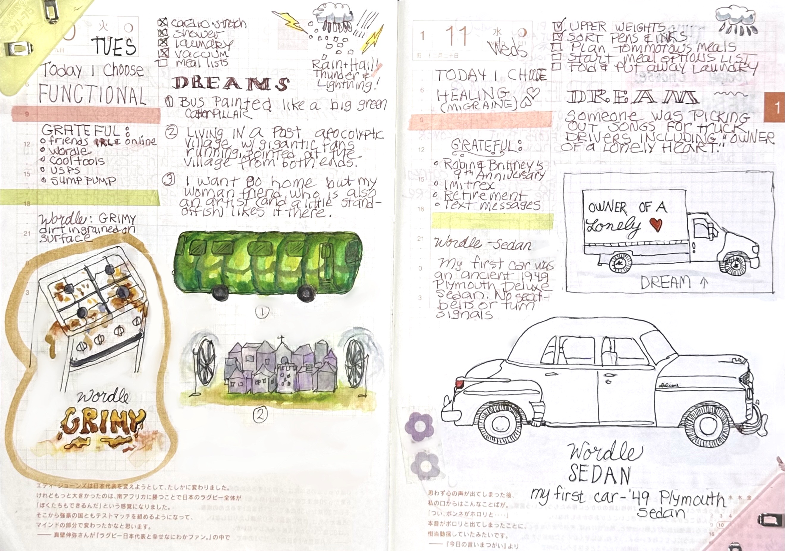 Wordle: GRIMY, SEDAN; Dreams: Lonely Heart, Bus, Village Fans