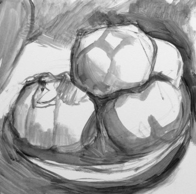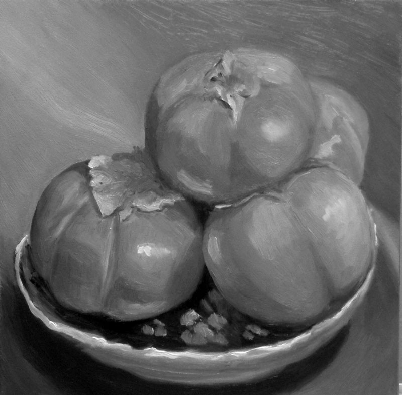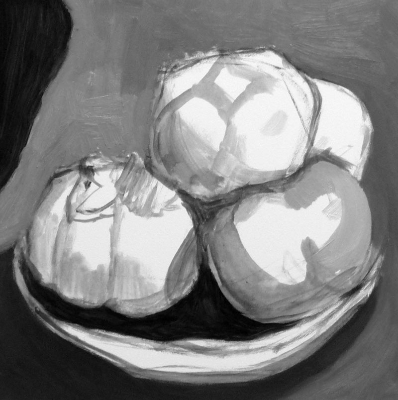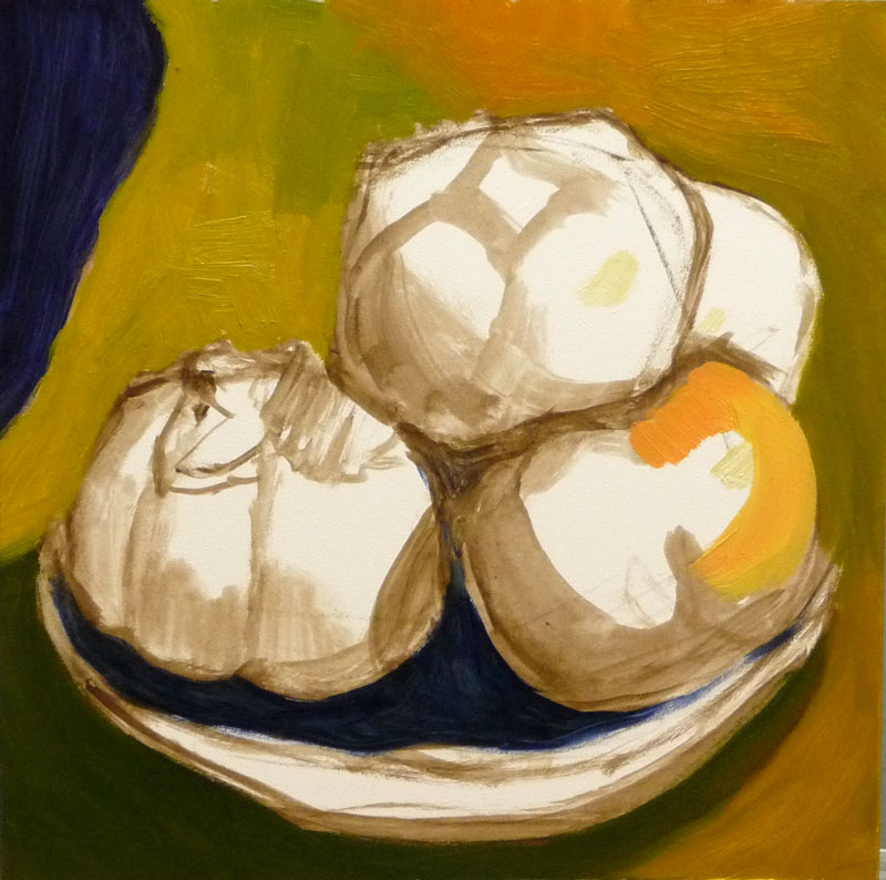 Because I try to use solvents as little as possible with oils due to their toxicity and smell, I can’t start with juicy washes for the first layer as I like to do when sketching out the composition with oils. And even with the minimal use of the least toxic odorless solvent (Gamsol mineral spirits) I found there was an odor (probably from linseed oil going rancid that was left in the solvent) that bothered me anyway. And then there’s the cleanup up dozens of brushes after a painting session.