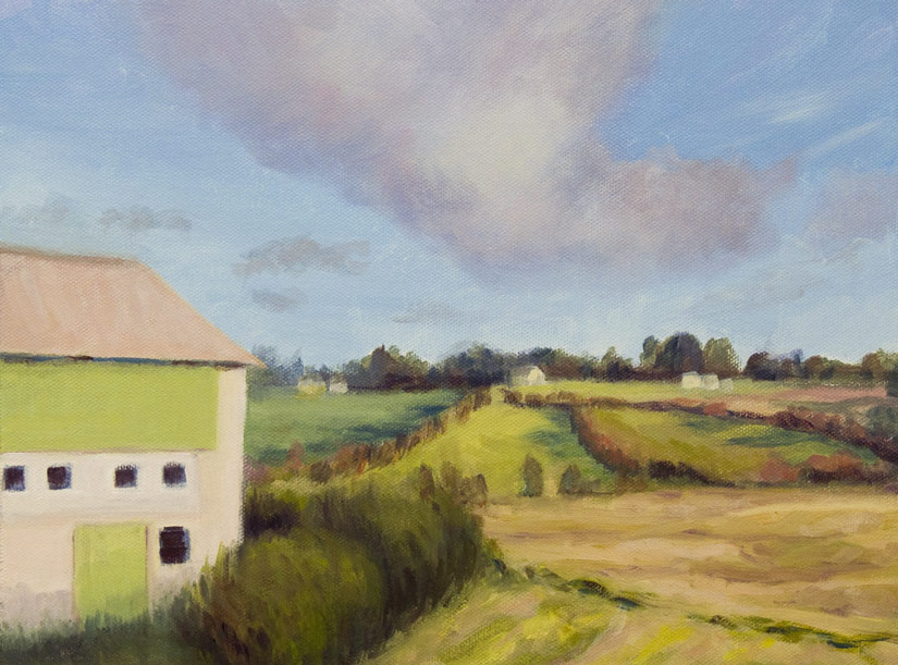 This month’s Virtual Paint-out is taking place in Norway. When I picture Norway it’s always snowing—silly me. I was amazed to wander the roads and see the beautiful summer light and perfectly maintained buildings and fields. There was so much gorgeous scenery it was hard to pick, but I couldn’t resist all the different greens in this scene.