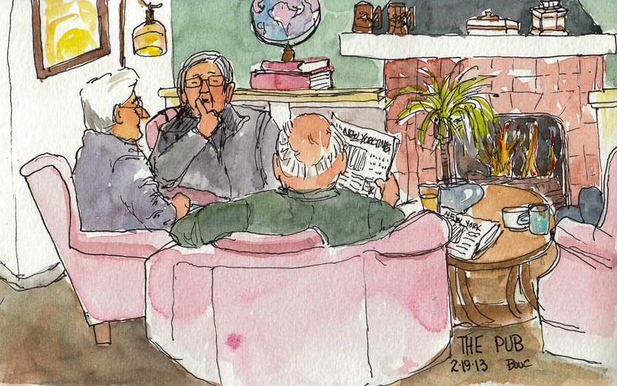 The Pub’s clientele tend to be colorful people who are interesting to eavesdrop on while sketching. The old guys I sketched above weren’t exactly firecrackers but the 40-something, rough-hewn guy in rainbow tie-dye and long blond hair sitting behind me kept me entertained with daring travel adventure stories of remote and distant lands told to his friend who was soon departing.