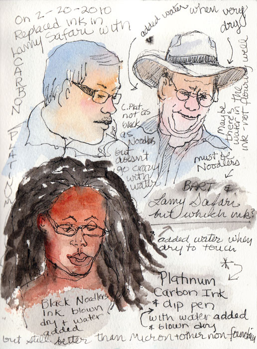I’d last filled the Safari with Noodlers Black Bulletproof ink, which is supposed to be waterproof but actually bleeds a fair amount when a wash is applied after it’s dry. I used a dip pen to test Platinum Carbon Ink and it held up better, barely bleeding at all.