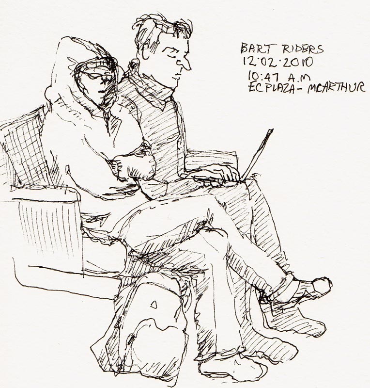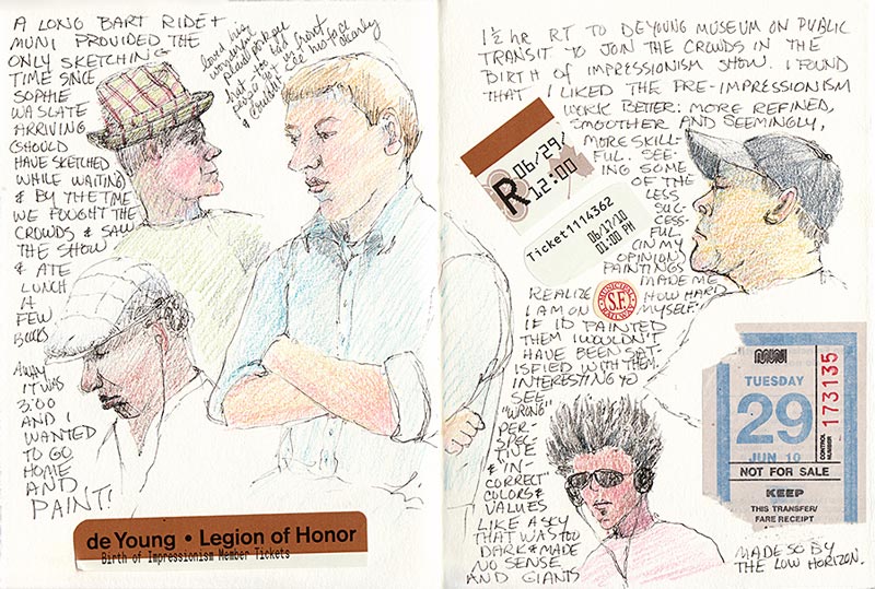 I’m not a fan of crowds, blockbusters or standing in line, but I put up with all the above to visit the Birth of Impressionism show in San Francisco’s De Young Museum in Golden Gate Park. I had planned to sketch in the park after the show but various delays only left time for these done while traveling there and back on BART and SF Muni.