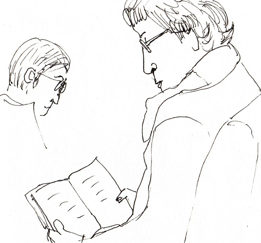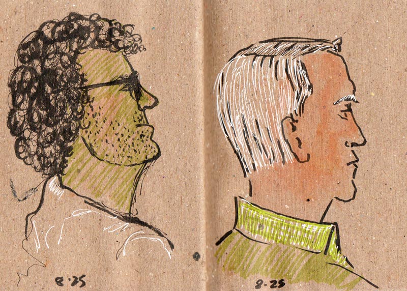 The guy on the left above was actually standing right above me on the subway and interested in what I had been drawing, posed for me. He was nice enough to say he liked it. I wanted to tell him I’d fallen in love with his chin, but figured that would be stupid.