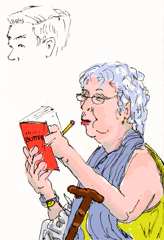 This lady carefully marked up her cheesy crime novel, “Guns Before Butter” with her pencil as she read. The train ride was really bumpy and so my ink line got pretty squiggly. I switched to drawing her after a big guy with a bike got on and completely blocked my view of the man above her.
