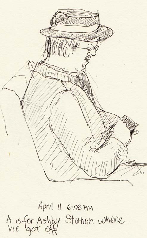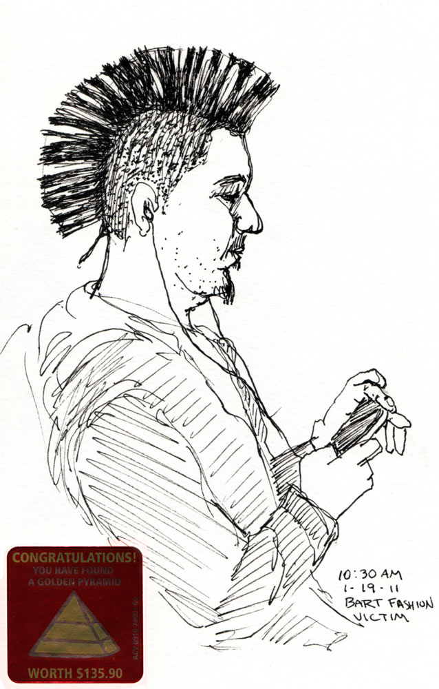 You can imagine my glee when this gentleman in full Mohawk sat down across from me on BART. Entranced by his cell phone, he never noticed me sketching and held perfectly still. It must have taken him a long time to get his hair to stand up so perfectly–and why? Especially first thing in the morning? I awarded him a sticker (on his page) from National Geographic.