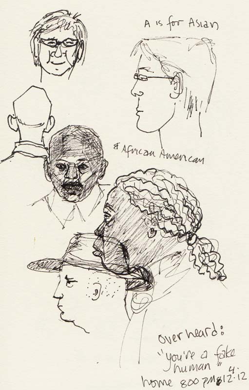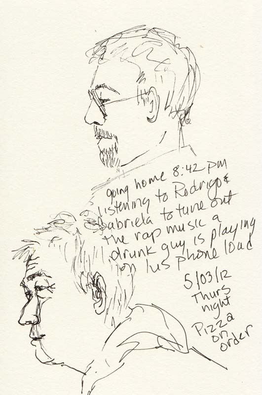 And if you were wondering about the post title “Innocent Vixens,” it was from something I heard on the radio. Someone said “innocent victims” and for some reason my mind wandered to “innocent vixens.” It seemed like a concept that might be fun to sketch someday and I wanted to remember it, so into the journal it went, above these innocent (though a bit dorky) BART subway rider guys.