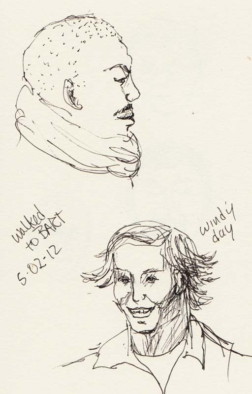 I experimented some more with the brown craft paper sketchbook, drawing with a black brush pen on BART and (above) adding white pen and colored pencil at home.