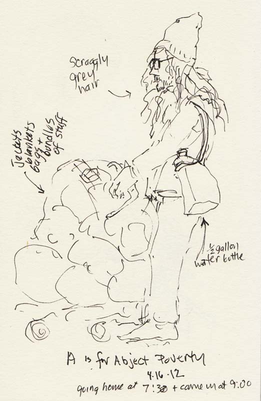 I’m wrapping up the last of my sketches in my last handmade sketchbook with these two subway sketches and next time, my end-of-journal self portrait. I didn’t get around to binding another journal one in time and so switched to a Moleskine watercolor sketchbook as a stopgap.