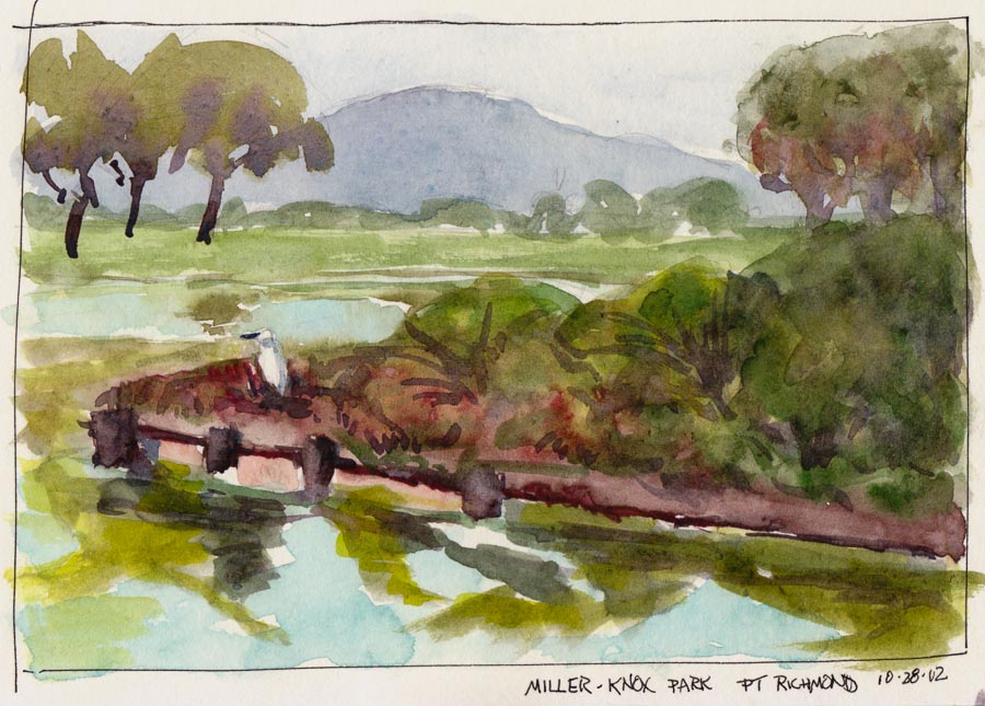 While my journeys may have become more interior thanks to the pandemic, illustrating where my imagination and dreams take me keeps me entertained. But I’m also including sketches from places I go in real life, like Point Isabel above, a huge park along the SF Bay where dogs can run free, roll in the grass, splash in mud puddles and rinse off in the bay.