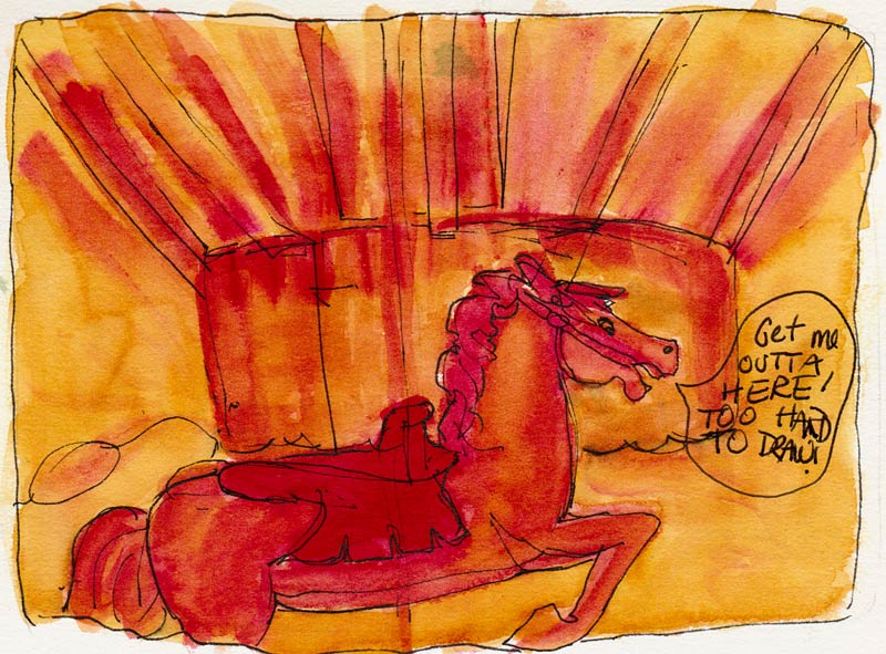Another quickie with the horse expressing my feelings: “Get me out of here! It’s too hard to draw!” My friend Cathy did some nice sketches of the carousel, posted here on our Urban Sketchers blog.