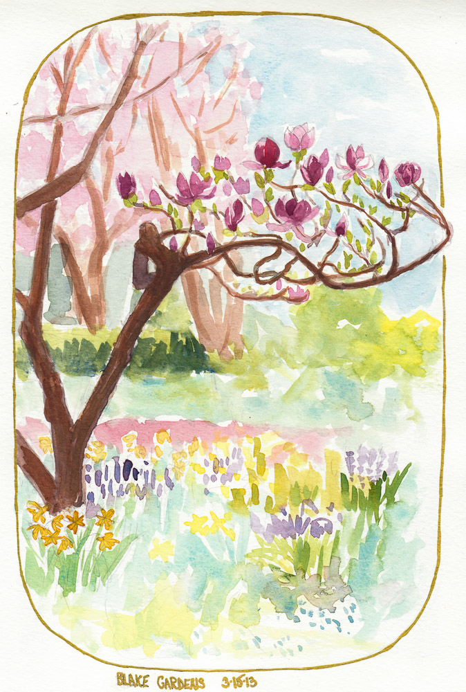 The tulip trees (Saucer Magnolias) and tulips were blooming when we painted at Blake Gardens on a sunny Friday a week ago. Of the multiple sketches and paintings I did of the scene, I think I’m happiest with the one above, done in my journal when I got home, from a combination of memory and photo. I clipped the text from their brochure and pasted it on the journal page.