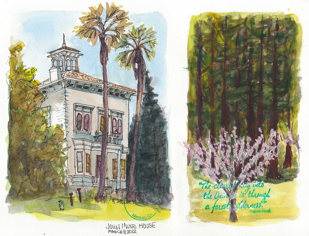 After I filled the jumbo Moleskine watercolor journal I discovered I forgot to post several pages. From March! So here are a few of those sketches from early spring. Above and below are the John Muir home, with a bit of the fruit tree orchards and redwoods on the property. I sketched and painted these on site, with a little gouache added to the fruit tree blossoms at home.