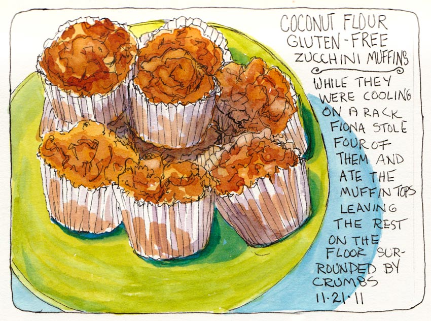 I rescued the rest of the muffins and set them on a plate to sketch (above). Then I ate one with a cup of tea. Yum!