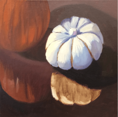 What an interesting painting challenge this was: strong warm light on a white gourd and a small pumpkin, with reflections and shadows on a shiny black plexiglass surface. Below are the steps as I worked on this painting (available for purchase on my DailyPaintworks gallery).