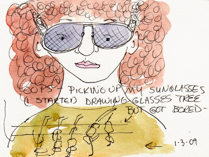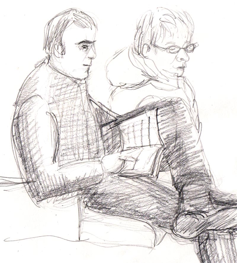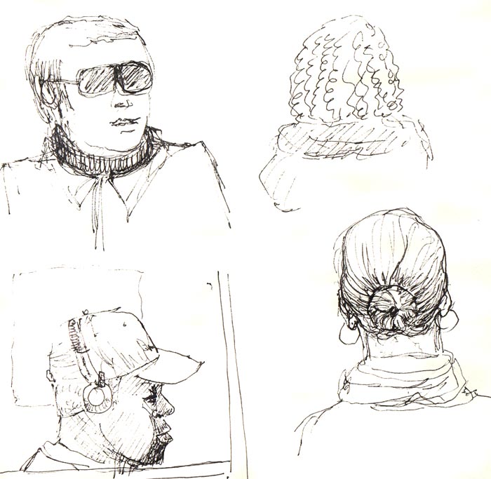I said I only had 5 minutes before I was getting off but they egged me on. I drew as fast as I could (in ink—what was I thinking!) and was making a pretty bad job of it—talk about pressure! Then I had to get off and we all had a good laugh about the bad sketch (see below). I asked if I could take his picture and he agreed, continuing the pose as I quickly snapped a photo with my iPhone and then jumped off the train as the doors were closing. Here’s the photo that I put on my computer monitor across the room to draw the sketch above in my sketchbook last night: