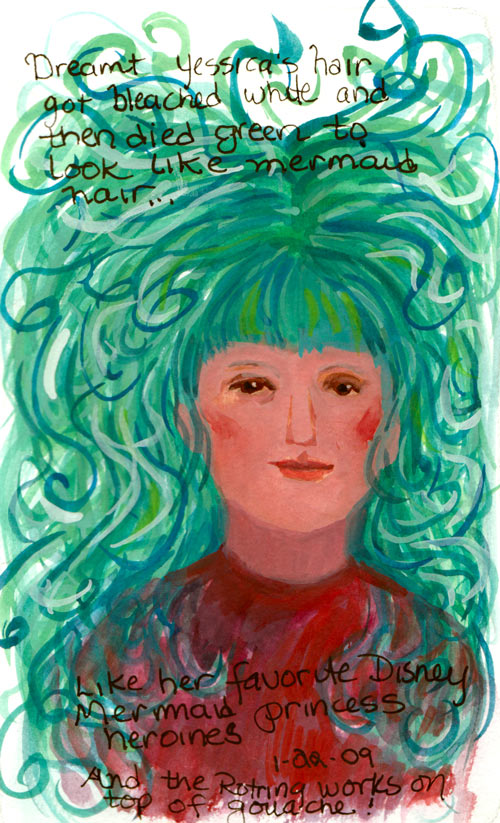 The next dream carried on with the odd colored top-knot theme. The long, black, silky, beautiful, Latina hair of the girl next door had been bleached white and then died mint green so she’d look more like the Disney mermaid princesses she seems to like so much.