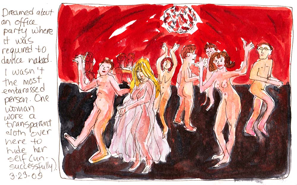 I dreamed that I was at an office party where dancing was to be done nude. I was having fun, and surprised that I wasn\’t the most embarassed person there. There was a woman who was so self conscious she\’d wrapped herself in a gauzy fabric trying to (unsuccessfully) hide beneath it. The dream was fun but it was even more fun to draw it and just see who appeared beneath my pencil.