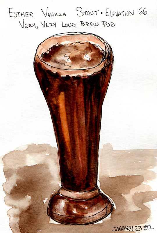 Even under the influence of a small glass of Esther Vanilla Stout, a delicious milkshake of a beer, it got so noisy by 8:00 on a Tuesday night that I couldn’t think straight and was ready to leave. I was having a hard time with drawing ellipses and symmetrical shapes (my next drawing subject to practice).
