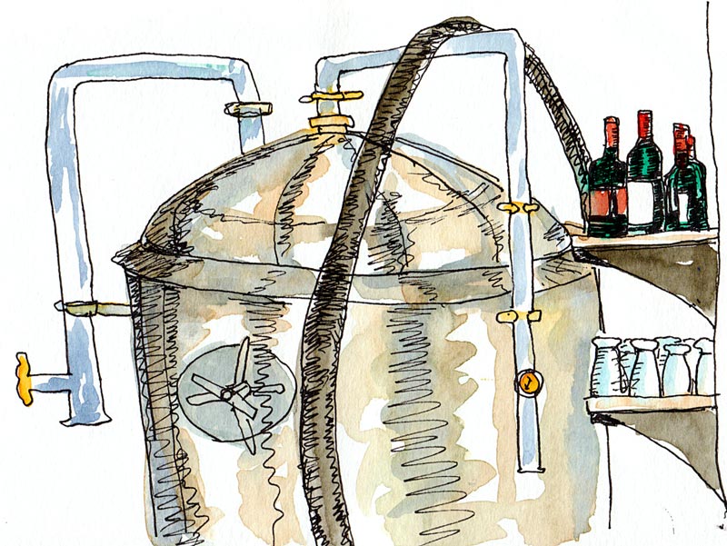 Pest Control at Pastime Hardware, ink & watercolor, 5×8″