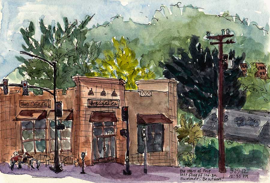 Peet’s Coffee and Albany Hill, El Cerrito, ink & watercolor, 5×8″ (shape on right near bottom is the roof of the Old West Gunroom)