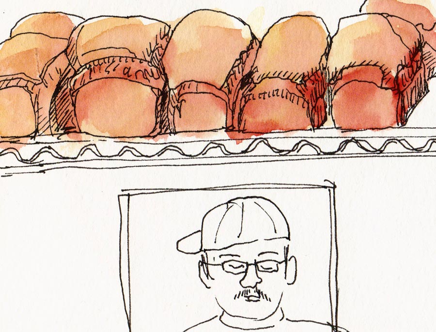I passed the little urban creek behind Peet’s, and considered sketching it but it was shaded by trees and very chilly. As I walked by the little pocket park alongside Albany Hill, this little cul-de-sac called out, “Paint Me!” With a handy picnic table right there to lay out my paints, how could I resist?