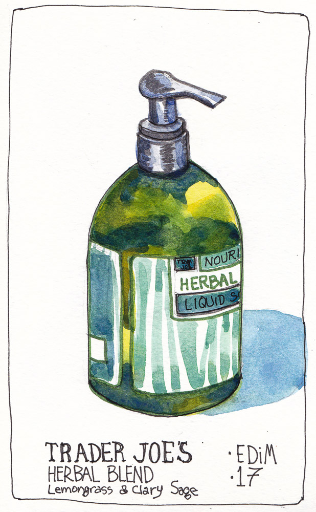 I love the lemony fresh scent of this soap and look forward to washing my hands. Normally I’m overly sensitive to scented products and stay away from them but this one makes me happy. I used a green Pitt Artists Brush pen to draw this and then went over it with watercolor and a little black fine point Pitt Artist pen.