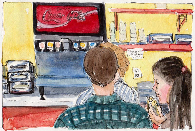 We sat on carpeted stairs (the only place to sit except the already occupied bench) and sketched the popcorn machine directly in front of us. At first it seemed like a stupid, boring subject, but within minutes I was captivated by all the odd mechanical bits inside the machine. Oddly, despite the strong scent of hot popcorn, the machine was completely empty.