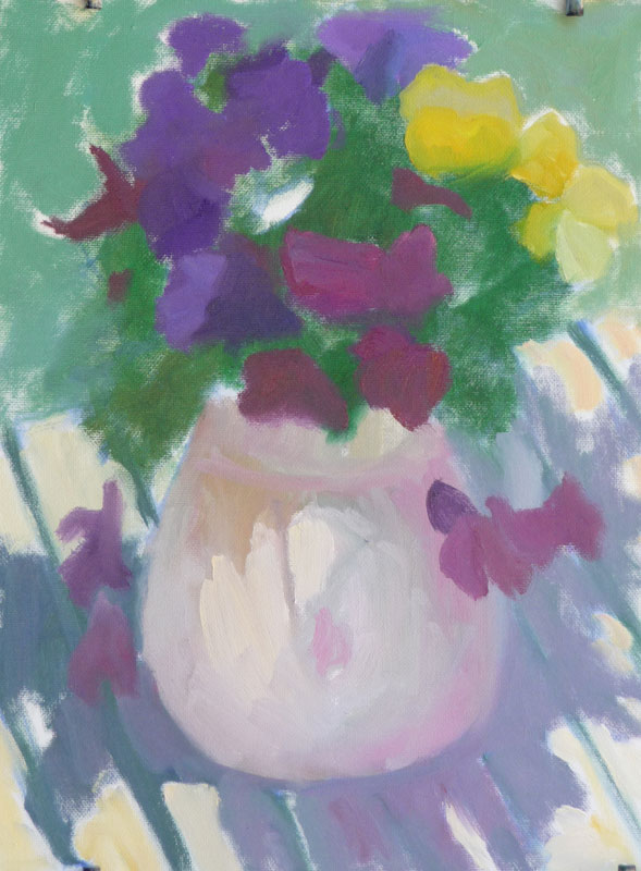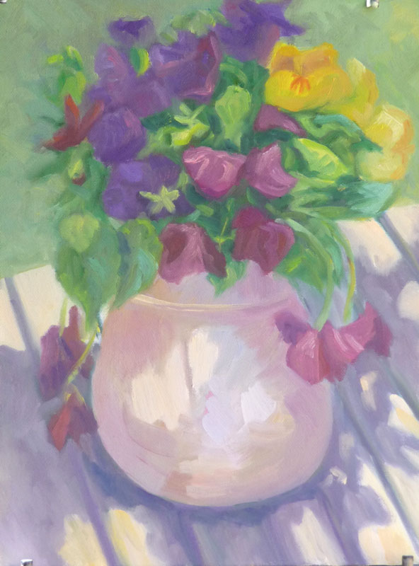 The weather was too perfect to paint indoors but I didn’t feel like driving anywhere. My next door neighbor was out pruning his pansies and he’d pulled out a whole bucketful he was about to put in the compost bin. Voila! A perfect painting subject. I stuffed a big clump of the pansies into a pitcher and set them on a table in the backyard.