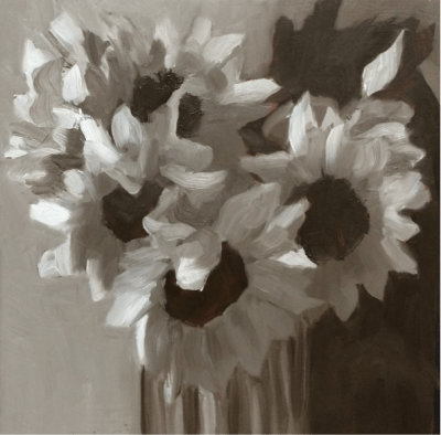 It might have been a more interesting painting if I’d a) included the lettering on the bottle and b) taken time to do a preliminary thumbnail sketch so that the flowers weren’t almost touching the top of the panel. I was interested in looking at white in shadow and gray in light and shadow and the colors found in both from the warmish light and flower reflections.