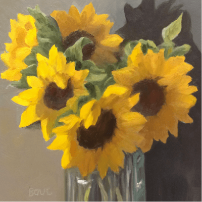 Sunflowers in Spaghetti Jar, oil on panel, 6×6 inches