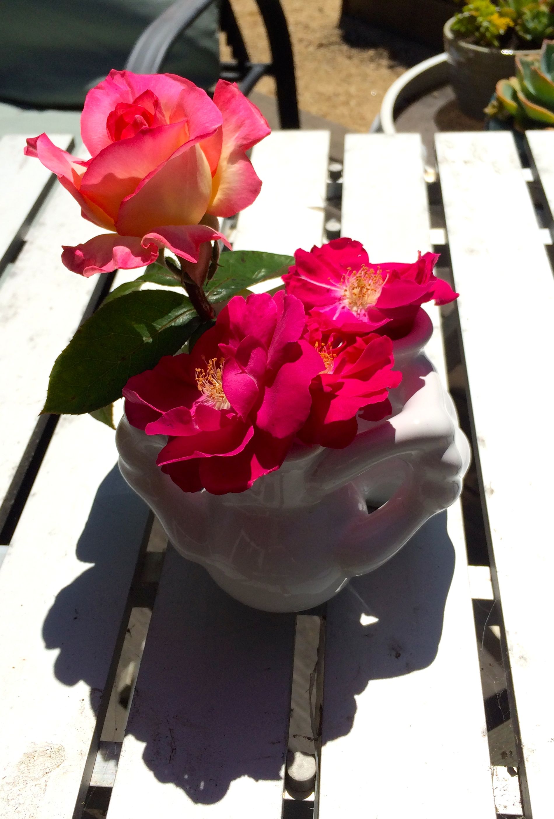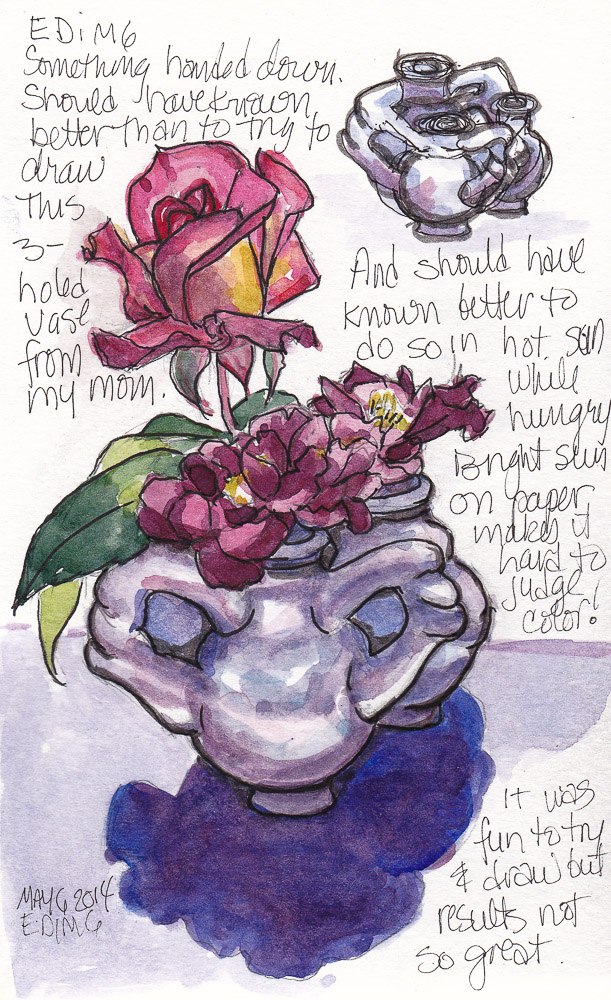 I found this wonderful old crock set out on the curb, adorned with a “Free” sign so I carried it home for my “Found Stuff” painting series. One handle had broken off but the owner had thoughtfully placed the pieces inside and I glued it back together. I love the way the flowers are reflected and shadowed on the crock. The painting is available here. Below are photos of the work in progress.