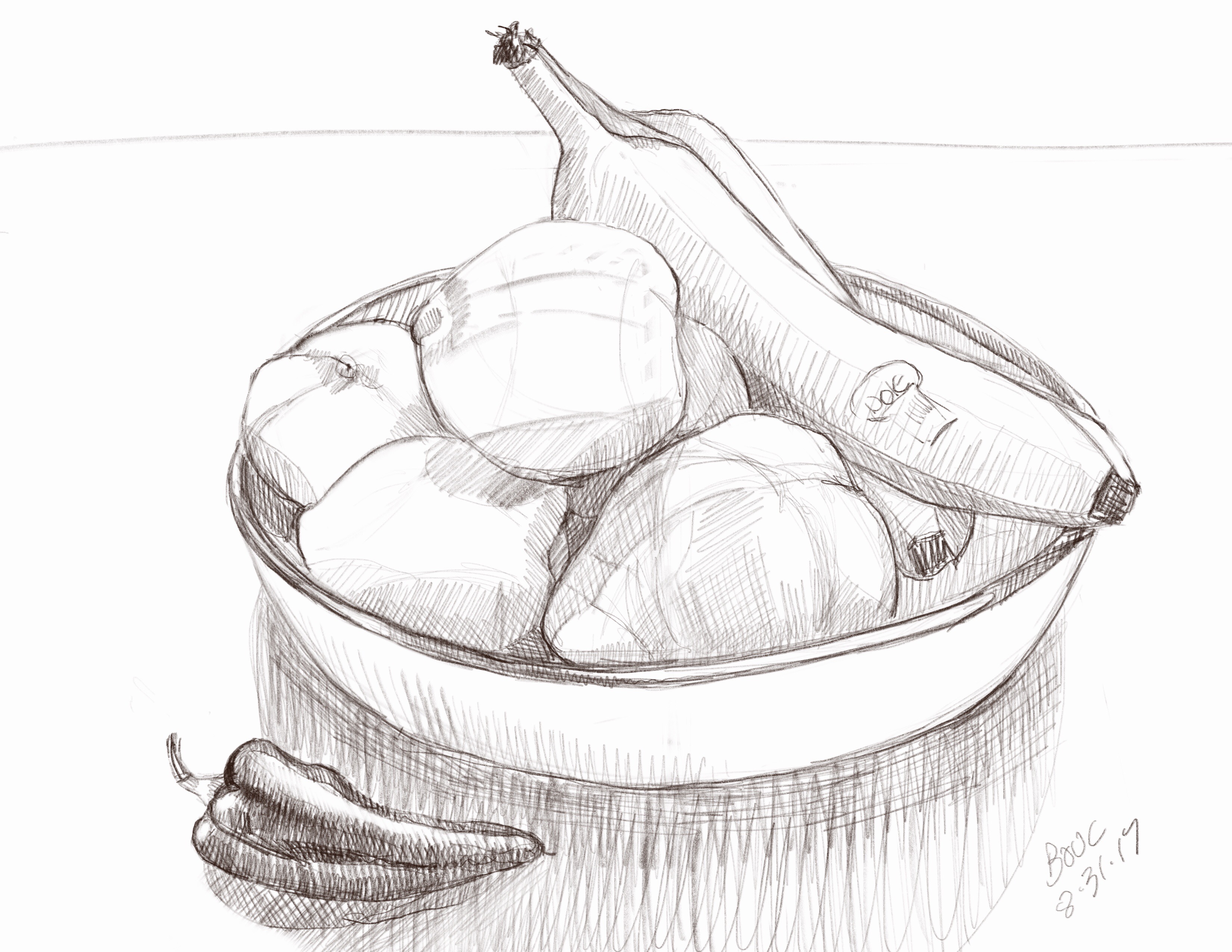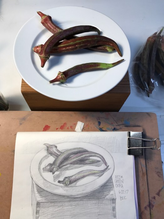 Not sure which I prefer. I couldn’t finish the drawing since I ate half of a peach and a banana for breakfast and then needed to refrigerate the rest.