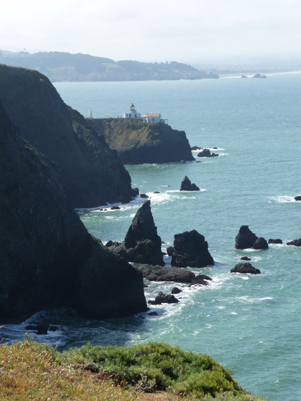 When I got frustrated with painting from life last month, I took a break and experimented in working from the same photo in different media. First I did the sketch above in my journal from the photo below which I took at Point Bonita in the Marin Headlands last year.