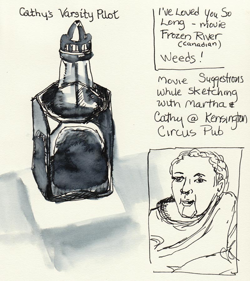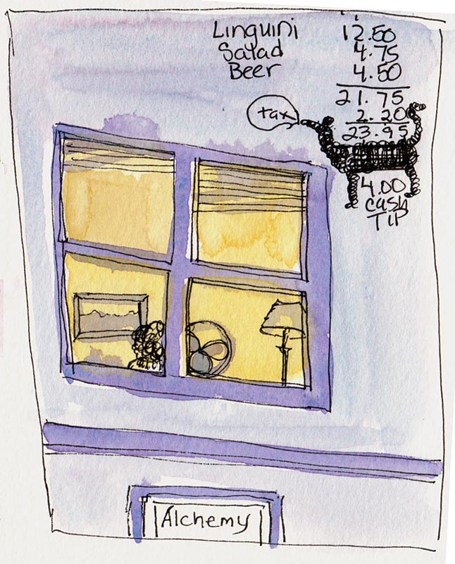 I stood behind Cathy while she leaned on a bike rack to sketch the signs on the corner. Then we walked up Hopkins to the Country Cheese and Coffee Market.
