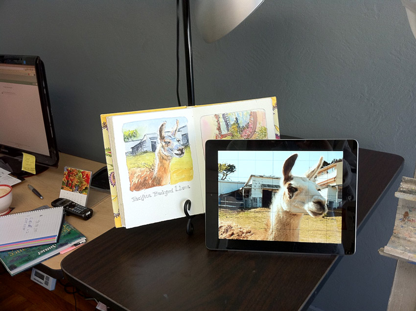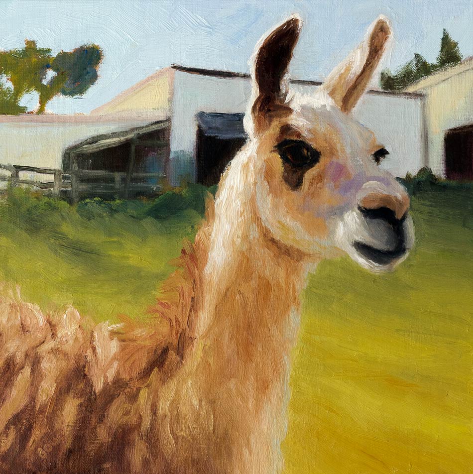 When I spotted llamas in a residential neighborhood backyard near the beach in Pacifica I took a few photos of them for painting later. In the process of this painting I experimented with a terrific new drawing tool, Accurasee, and put this llama through its paces.