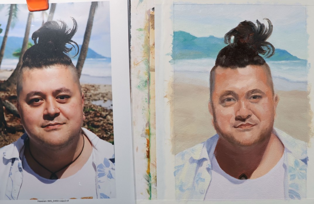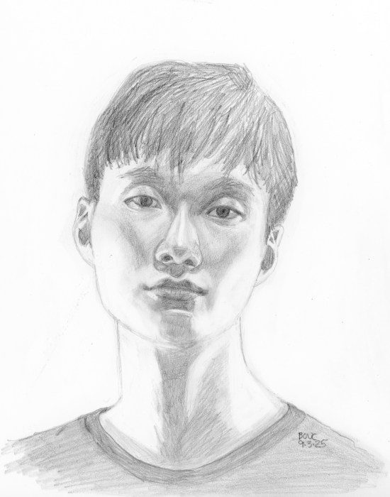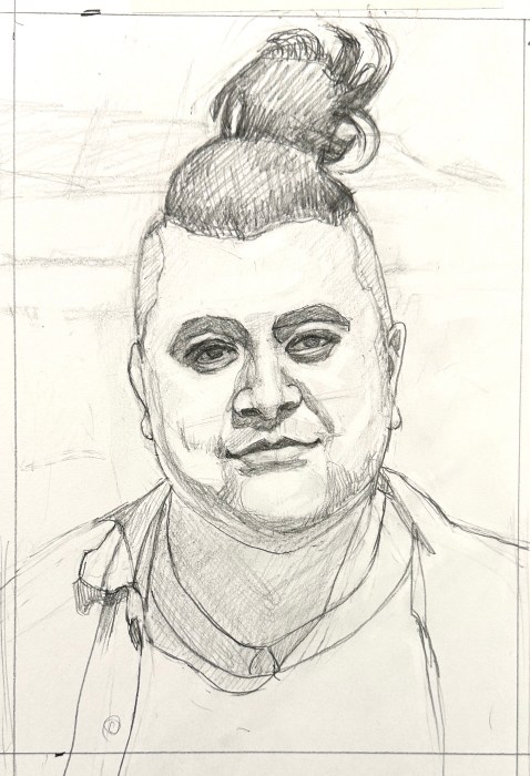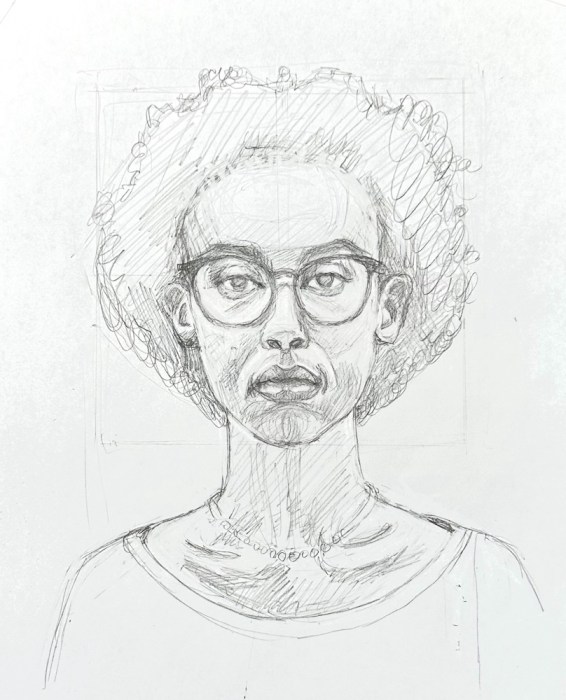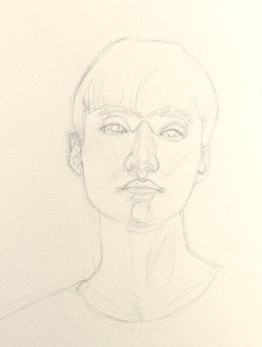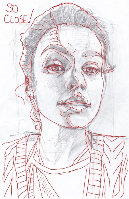 Below are my two preliminary pencil drawings and the painting, second layer done. I should have left it as it was—blocky, but fresh. Instead I labored over it, trying to match values and colors to the original despite the crazy palette.