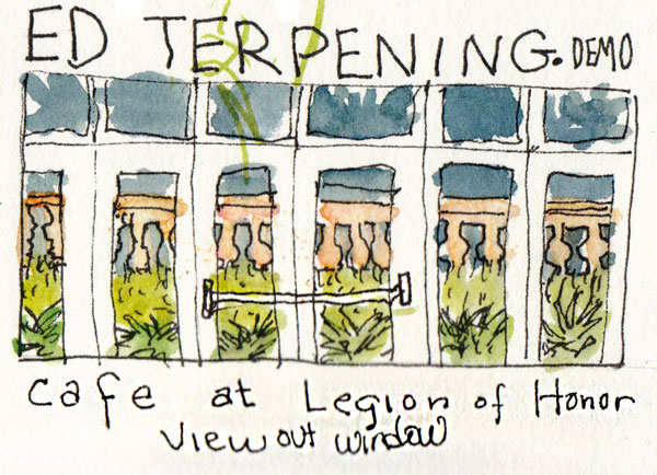There were about a hundred noisy, smoky mopeds, coming up the hill and then circling around and around, more and more of them. Finally they left and I made it across the street and directly to the museum’s café for a much-needed latte. While I sipped I sketched the view out the cafe’s french doors (except they didn’t have Ed’s name above them):
