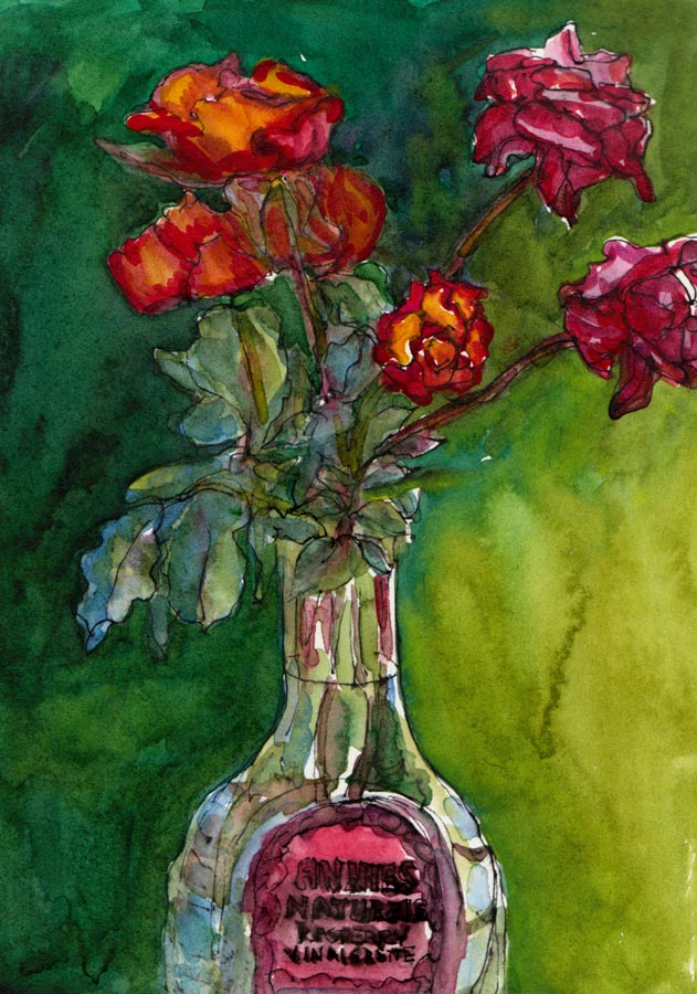 Either they jumped out of their vase or my cats had a hand (er… paw) in their escape. After a few hours back in water they plumped right back up and were a joy to draw. I only had about an hour and that was just enough time to make a happy ink and watercolor.