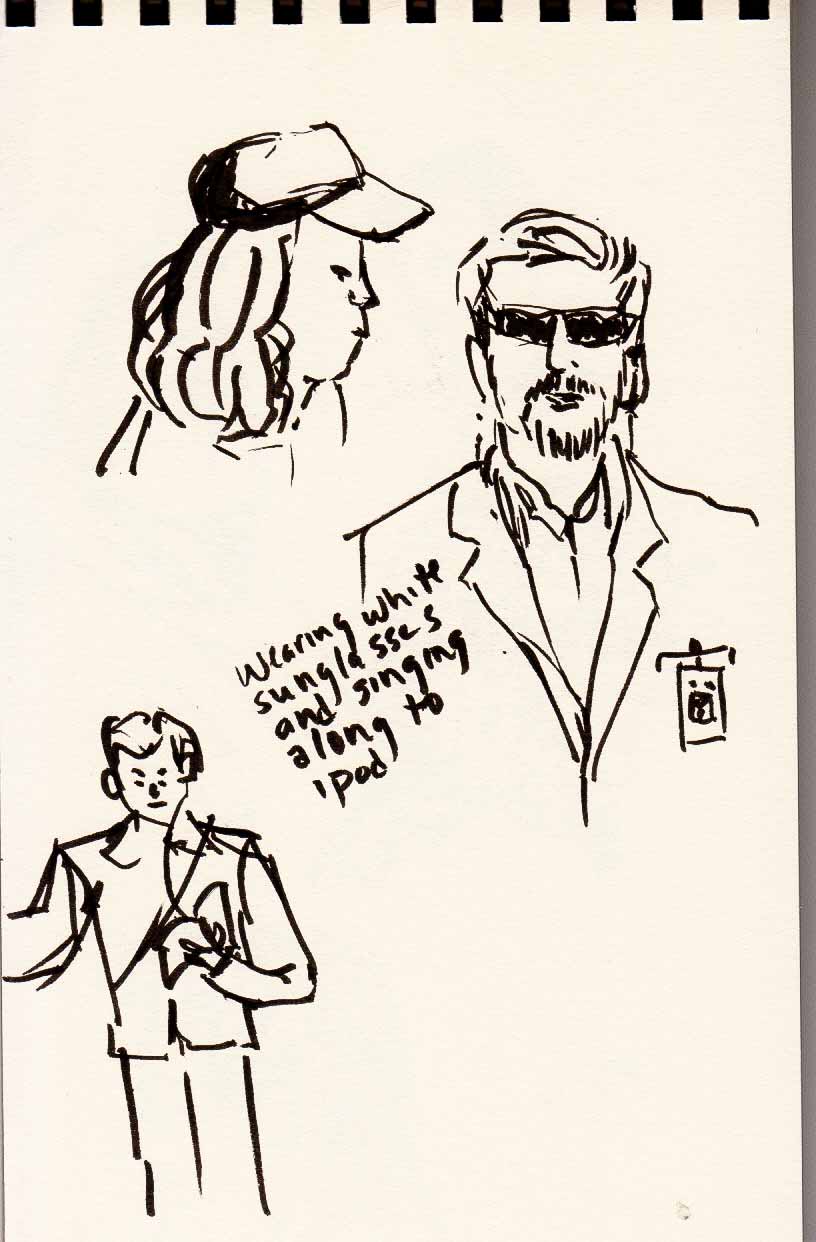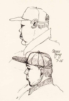 The guy on the left above was actually standing right above me on the subway and interested in what I had been drawing, posed for me. He was nice enough to say he liked it. I wanted to tell him I’d fallen in love with his chin, but figured that would be stupid.