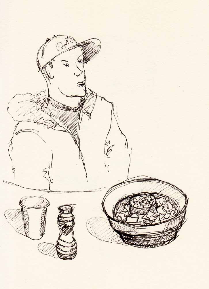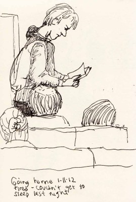 This lady carefully marked up her cheesy crime novel, “Guns Before Butter” with her pencil as she read. The train ride was really bumpy and so my ink line got pretty squiggly. I switched to drawing her after a big guy with a bike got on and completely blocked my view of the man above her.