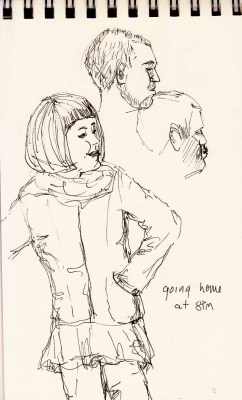 I’ve gotten so used to sketching people in public that sometimes I forget to be subtle. Then I get glares or confused looks from people who can’t figure out why I keep looking at them. One day a guy down the train was holding up a camera and continuously filming everyone which I found annoying. Filming seems more intrusive since my drawings rarely capture a close-enough likeness for anyone to worry about.